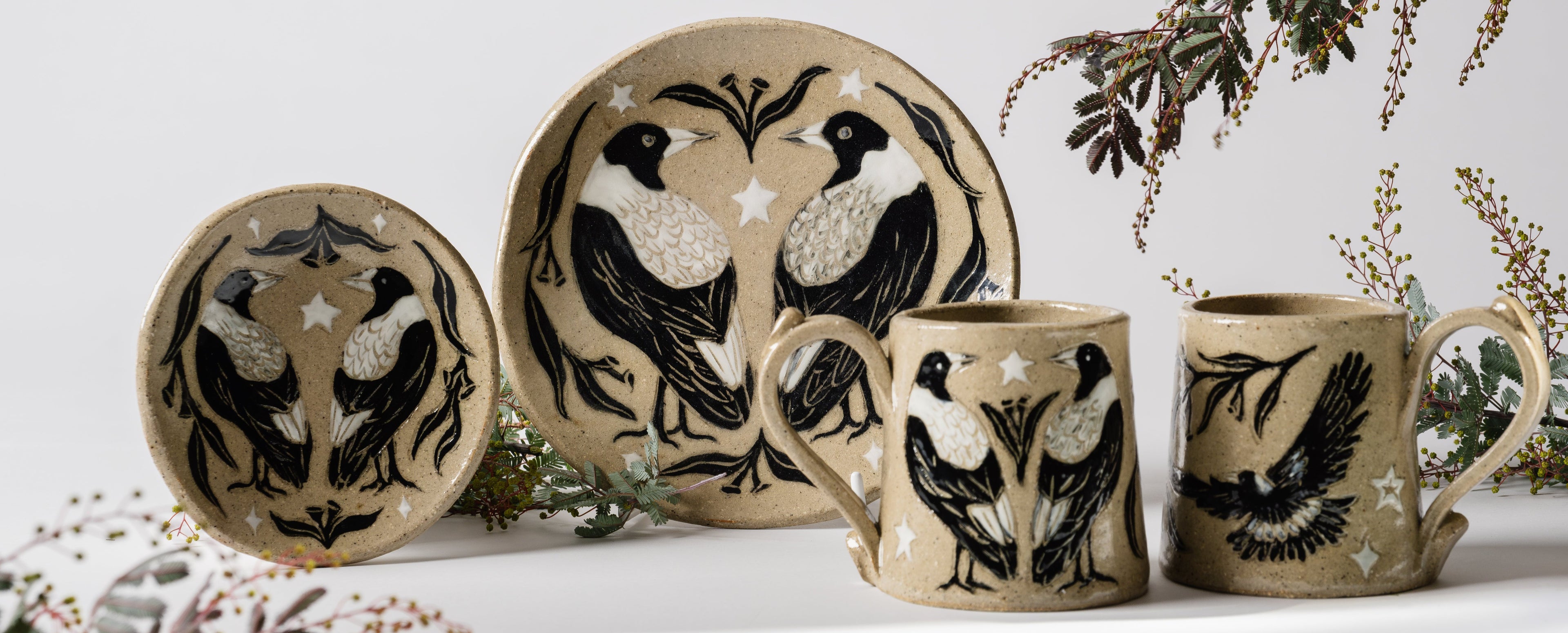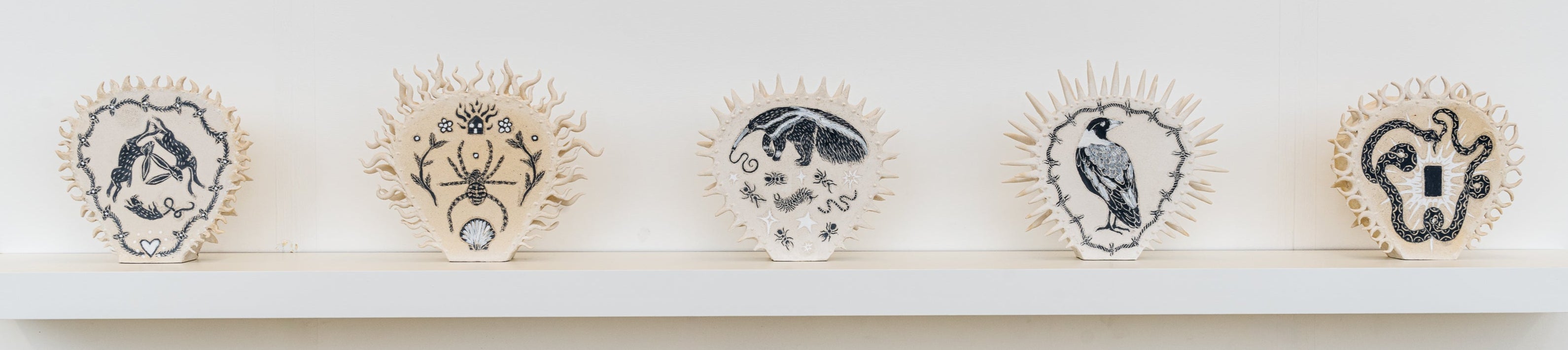 Small batch ceramics, hand carved with flora, fauna, and fantasy. Made on Kaurna Land by Belinda Guerin.